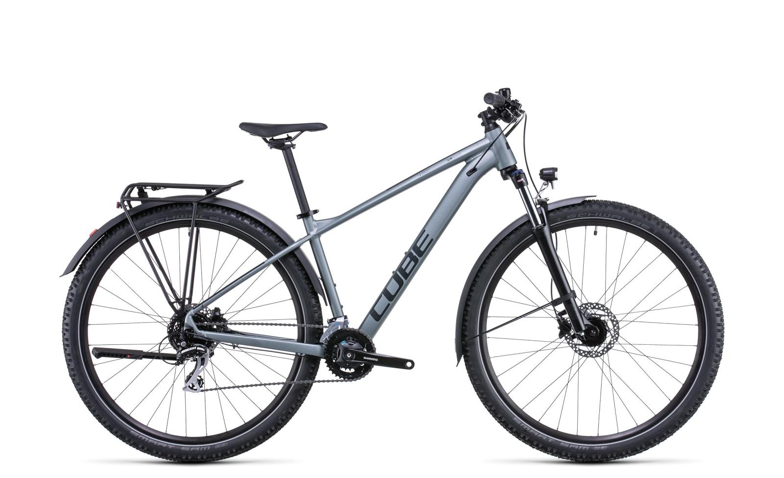 Ein Bike, das alles kann – gibt es das wirklich? Wir bei CUBE sagen: Ja, das gibt es und hier ist es. Das Aim Race Allroad punktet mit einer Vollausstattung mit Schutzblechen, Lichtanlage, Gepäckträger und Seitenständer, also allem, was man zum Einkaufen in der City oder für den Weg zur Arbeit braucht. Sobald das Wochenende startet und die Trails rufen und locken, kommen die (blockierbare) Suntour Federgabel mit 100 mm Federweg und die hydraulischen Scheibenbremsen von Shimano ins Spiel. Obendrauf gibt’s bei diesem Alleskönner 2.25 Zoll breite Reifen, einen Rahmen, der mit einer versenkbaren Sattelstütze ausgerüstet werden kann, und: eine zuverlässige Shimano 2×8-fach Schaltung. Damit ist man zu jeder Zeit für alle Abenteuer bereit – also auf geht’s!